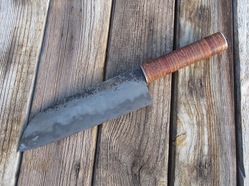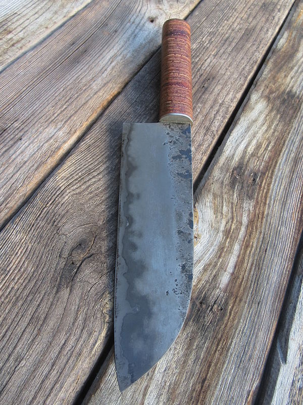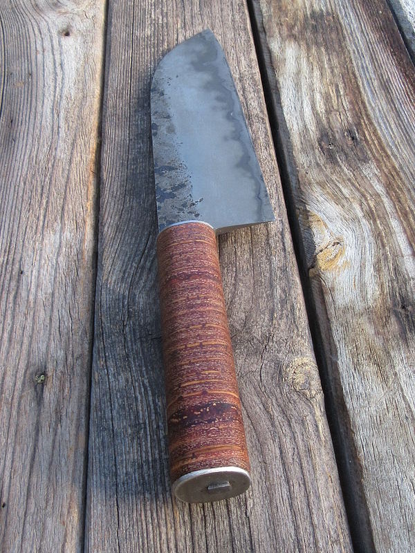 Die Klinge dieses Messers wurde nach alter Art in reiner Handarbeit nur mit Hammer und Amboss geschmiedet. Sie ist aufgebaut aus 3 Lagen. Die Schneidlage besteht aus unlegiertem Carbonstahl mit einem Kohlenstoffgehalt von 1 Prozent. Für die Außenlagen wurde ein weicher Konstruktionsstahl verwendet